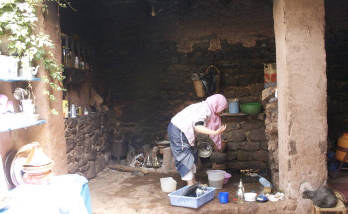 Our trek starts from Imlil with about 1h and 45 min. hike upwards in eastern direction towards Tizi’n’Tamaterte (2279m). Our path will lead through barley fields and orchards of cherry, walnut and apple trees to Tamaterte village. After passing the village, we will follow the pathway leading us up through the forest of pine and juniper trees. In Tizi we will have a short stop to enjoy the beautiful Imlil and Imnane Valleys with Berber villages stretching around us, precariously tucked onto the slopes. Then we continue for another hour until we reach Wanskra and Amagdoul villages. Here on the plateau we will have our field picnic. In the afternoon we will spend some 2 h to hike along mule trails up through the valley to an ancient Berber village. We will spend our night in a gite d’etape in Tachdirth (2291m).
