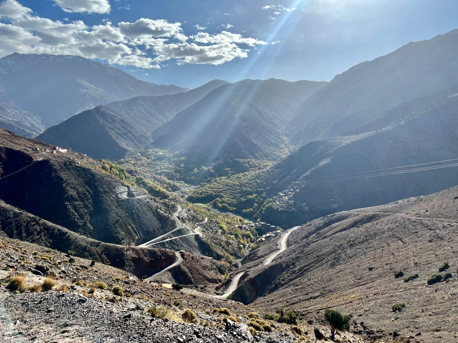 We leave Marrakech early to start our Morocco tour and drive through Moulay Brahim to the foothills of the western High Atlas mountains. Here we start at Imi Oughlad (1450m). The mighty peaks of Jebel Toubkal, at 4167m the highest peak in north africa, Aglzim 3650m and Aksoual 38847m surround us. This is where we meet our muleteer and set off for a two hour hike to Tizi n Tachete. You’ll be on a track winding through pine and juniper trees.