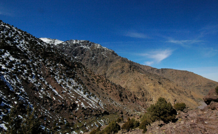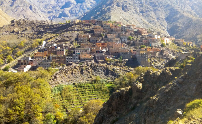Marrakech to imlil Atlas Mountains, Departure by car from Marrakech around 9am in the morning for 1h30 hour drive south up the Moulay Brahim Gorges, Asni weekly market every saturday then to Imlil (1740m), set in the upper level foothills of the Western High Atlas mountains, a main trailhead with streams and paths branching out in all directions. Here we shall leave our vehicle to take a welcome glass of mint tea in the village and meet your local guide prior to setting out for some 4km excursion. towards the south to the Berber village of Aroumd (Aremd) (1843m), passing the hamlets of ait souka, Targa Imoula, up and down the stark slopes, the jagged Western High Atlas peaks of the Toubkal Massif before us – Jbels Aguelzim (3547m), Aksouâl (3847m) and the Adrar Adj (3122m) watching us all the way.